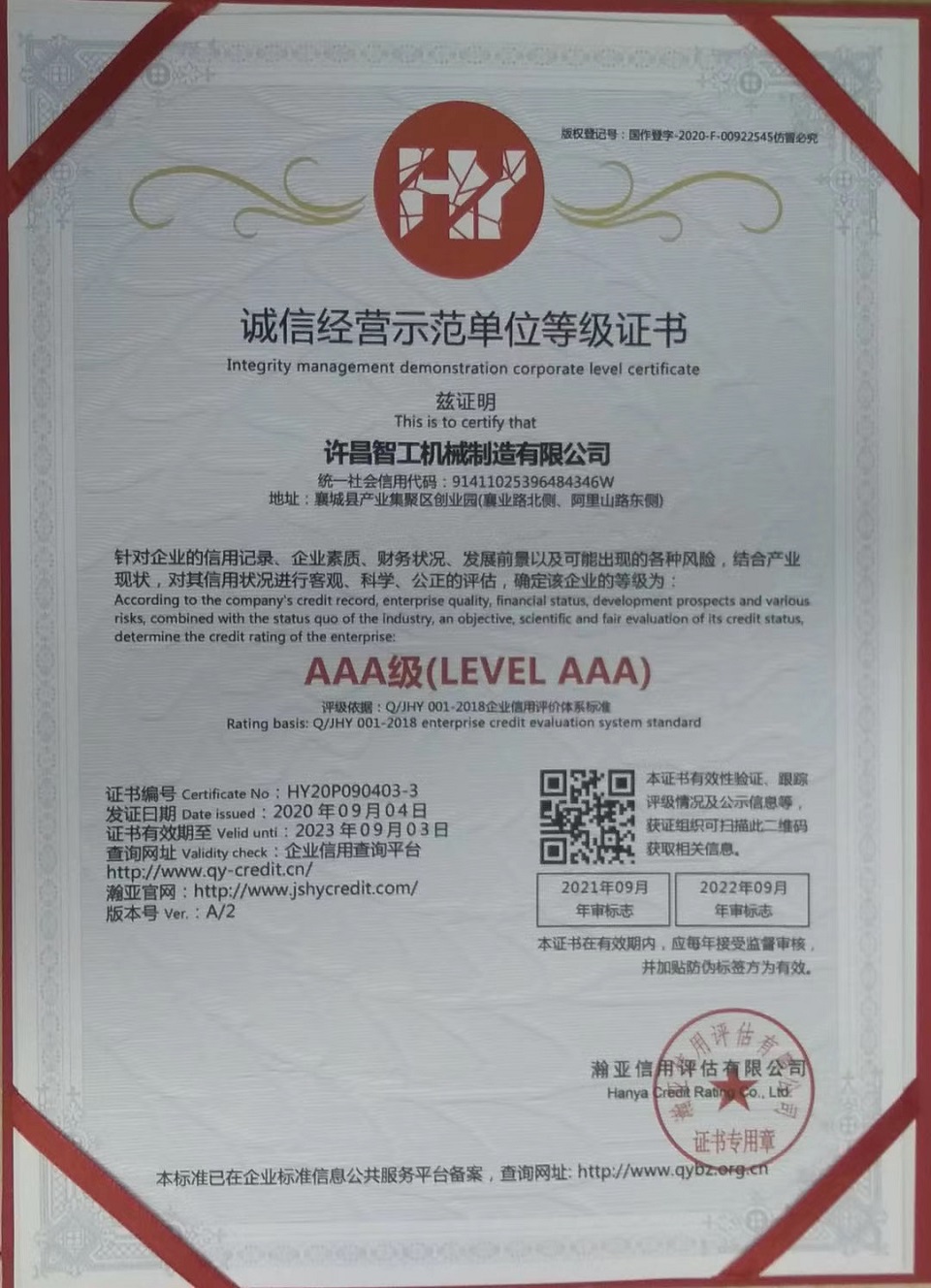 許昌智工榮獲AAA級信用單位