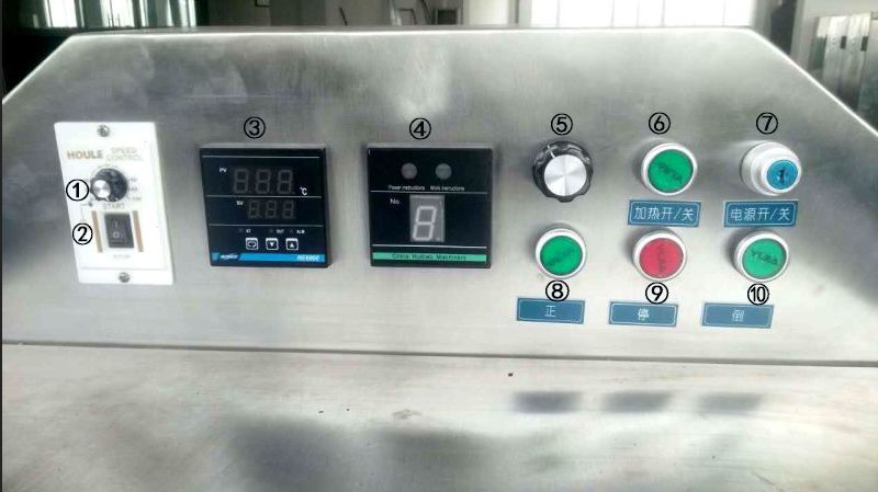 五、調(diào)節(jié)炒鍋轉(zhuǎn)速:調(diào)節(jié)圖片上“①調(diào)速器旋鈕(正面白色)”,順時(shí)針調(diào)節(jié)加速,逆時(shí)針調(diào)節(jié)減速。(注:可根據(jù)炒制品特性,適當(dāng)調(diào)整。)