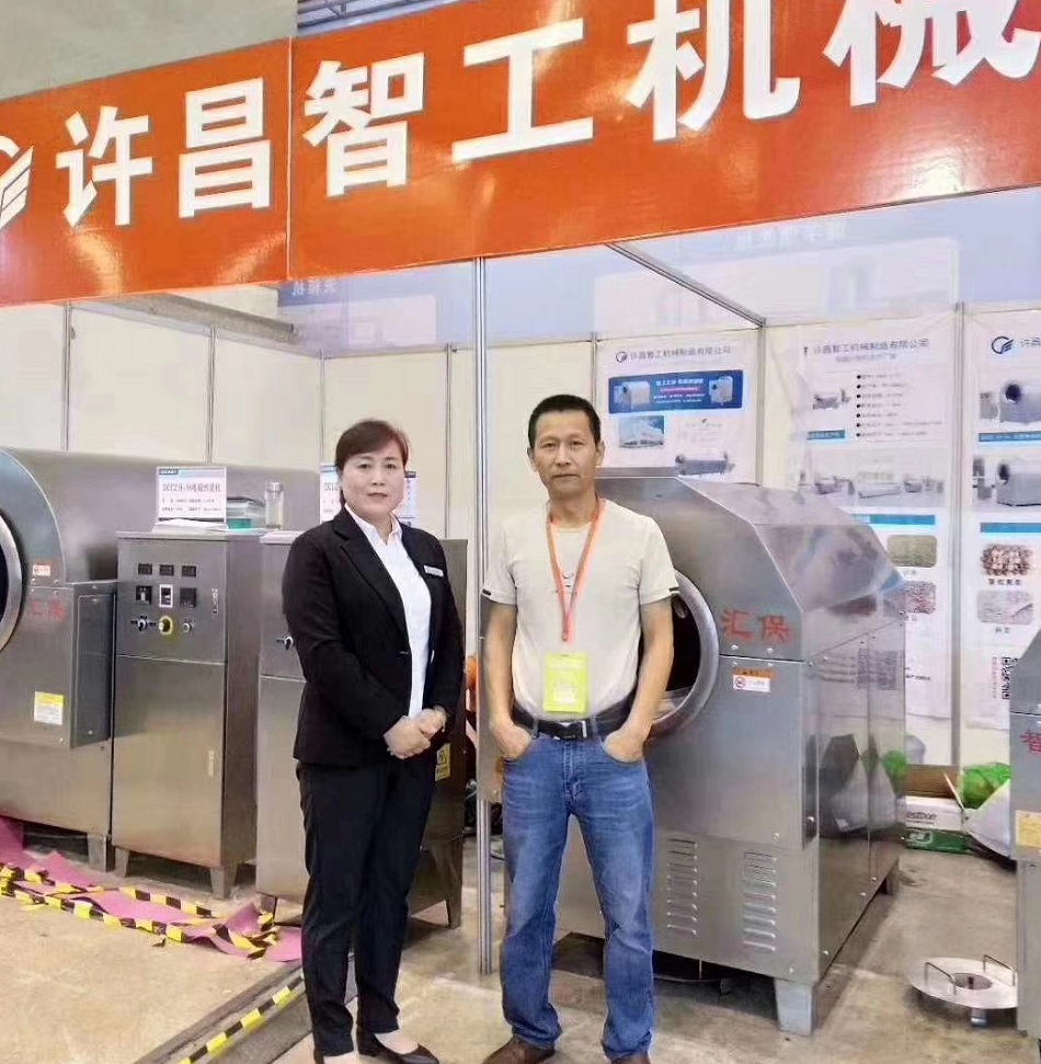 青島五谷金園調(diào)味品有限公司崔總在展會現(xiàn)場訂購中型多功能電磁炒貨機